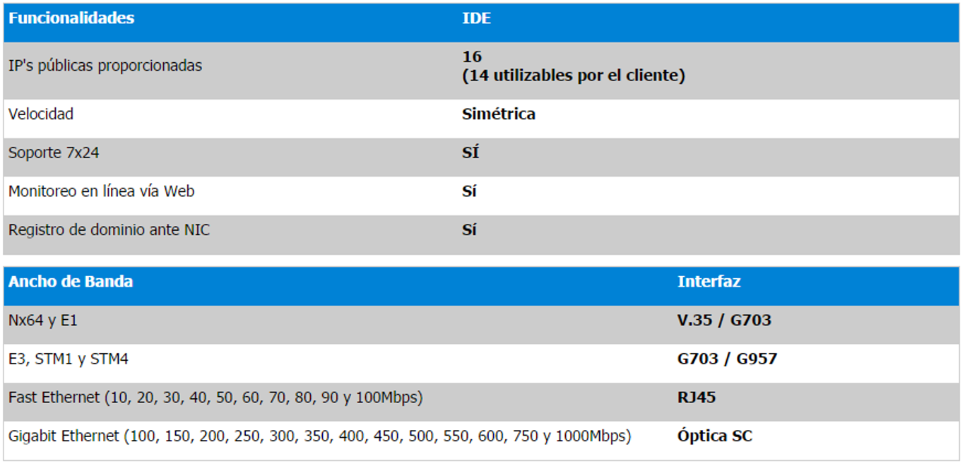- Salida internacional: 900 Gbps. Por medio de 90 enlaces STM4 hacia Estados Unidos.