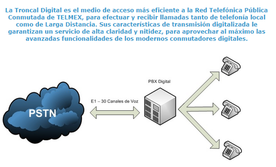 Troncal digital: Es una línea telefónica que es entregada multiplexada en un enlace tipo E1, utilizando diferentes medios de acceso, principalmente cobre. La capacidad de un E1 es de 30 canales (cada canal tiene 64Kbps), por lo que puede transportar un máximo de 30 troncales digitales.